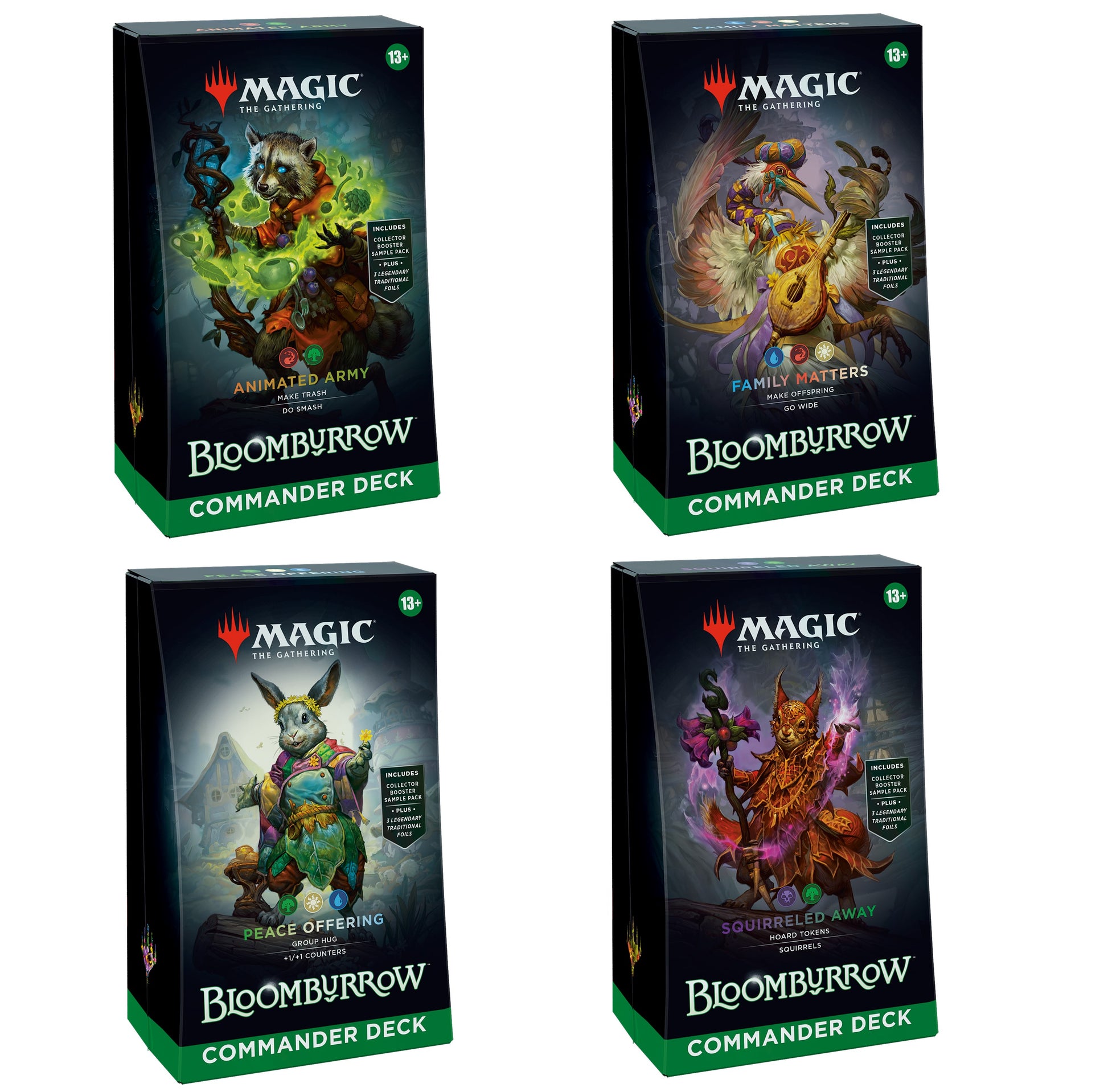 In Commander, four players come together to show their strength and strategy, with one player coming out on top. Each 100-card ready-to-play Bloomburrow™ Commander Deck makes it easy for Commander fans in your store to grab a deck and play right away.